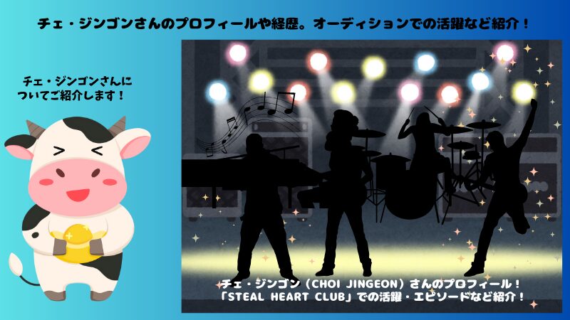 今回はオーディション番組「STEAL HEART CLUB」にギターポジションで参加されているチェ・ジンゴンさんについて取り上げてきました。
